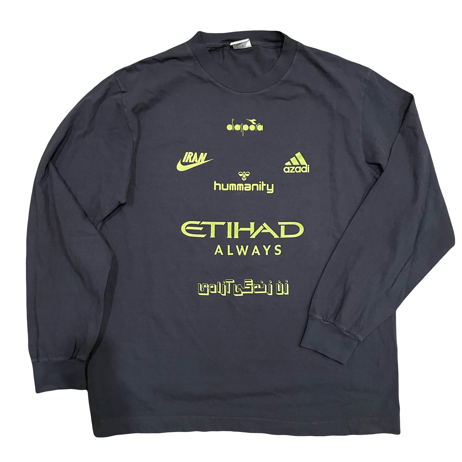 Slate unisex longsleeve with chartreuse logos screenprinted. Printed on 100% recycled cotton unisex Everybody World longsleeves.